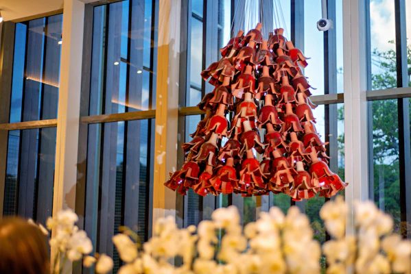 As campânulas que compõem o conjunto, sustentadas por um fio de aço, assumem tons diversos dentro de uma paleta terrosa – do vermelho escarlate ao laranja – obtidos a partir de barros de diferentes tipos e queimas em temperaturas variadas. As criações de Pedro Godoy são, assim como o solo, generosas, suculentas e plenas de referências ao território.