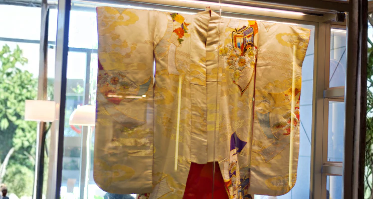 Um quimono em seda se impõe como peça central, atraindo o olhar por sua majestade. Ricamente bordado em tons de dourado, prata, laranja e vermelho sobre a superfície acetinada, quase uma madrepérola. Trata-se de um Uchikake, traje nupcial feminino que viajou do Japão ao Recife como presente enviado por uma sobrinha a Tomiko Matsumoto.