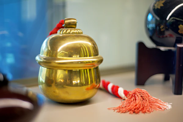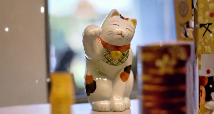 Ao lado da vitrine que expõe e protege a veste festiva, uma prateleira sustenta uma sequência de objetos carregados de significado. Entre eles está o já popularizado Maneki-Neko, o gato da sorte que convida a fortuna para dentro de casa e, por isso, deve ser colocado diante da porta principal. Na função de anfitrião discreto, ele acena as boas-vindas à abundância e à proteção.