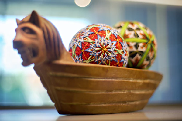 As Temaris – bolas tecidas manualmente com diferentes tipos de fios – foram confeccionadas por Tomiko e presenteadas ao filho, André Saburó. Em tamanhos e cores variados, alinham-se cumprindo sua função simbólica de carregar boas energias, um gesto delicado que expressa votos de prosperidade.