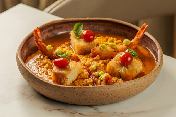 A criação do chef Pedro Godoy valoriza o pescado, combinando técnicas simples com sabores intensos. O uso do dendê, do coco e da banana-da-terra remete diretamente às matrizes africanas e indígenas que moldaram a culinária local, transformando a refeição em mais do que sustento: um gesto de memória, partilha e celebração da vida que se renova à mesa.