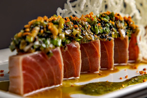 Quando selado, o atum fresco revela novas notas de sabor, características da integração com o fogo, que se combinam com o adocicado do molho tarê – doçura, gordura, textura e umami em harmonia com a apresentação artística. O fato de essa especialidade ser preparada com o akami – parte do peixe localizada perto das costas, de consistência firme e tonalidade mais avermelhada – favorece a montagem como escultura.